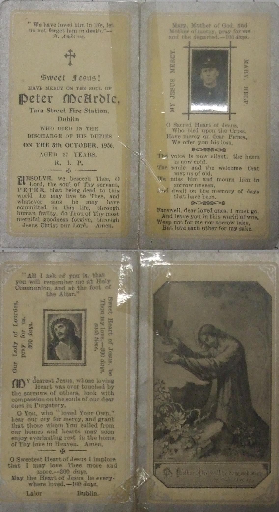 Fireman Peter McArdle– who left a wife and seven children (His funeral mass card is shown below)