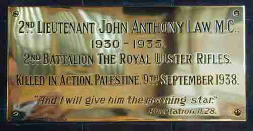 At the Law Memorial in the Chapel in St. Columba’s College, Whitechurch, there is a plaque to 2nd Lieut. John Anthony Law who was killed in Palestine on the 9th September 1938: