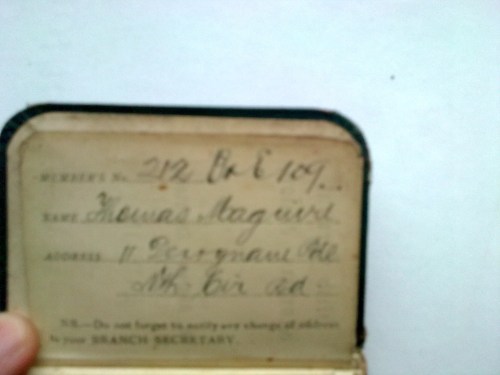 It appears to have been the possession of a Thomas Maguire who lived at 11 Derrynane Hll (sp?) off the North Circular Road. Thanks to some helpful friends on facebook, I’ve been able to track down a Derrynane Parade (which is indeed off the NCR) but have found no reference to a Derrynane Hill or a Derrynane Hall. Perhaps the street was renamed or his address was written in by someone who misheard him.