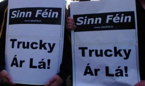 While Dublin comes to terms with truckgate today, I got a laugh out of this excellent image doing the rounds from the ICTU protest yesterday at the Dail. Nice one lads, nice one.