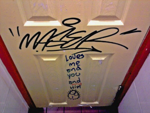 By now you’ll have noticed that we’re fans of street art, and in particular a figure that goes by the name of Maser. We’ve covered pieces of his that have appeared around the city in the guise of his project with Damien Dempsey, his pieces at the Bernard Shaw and appearances at Oxegen. So I couldn’t help but grin when I spotted this in The Hophouse on Parnell Street the other week. I’m not sure if he is still tagging on bathroom walls, but when you consider Banksy pieces are selling for millions worldwide, with councils knocking end walls off houses with murals on them to flog to American arthouses, maybe I should have pulled this jacks roll dispenser off the wall. Could be worth a bomb some day…