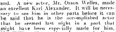 “Orson Welles, star of the New York Theatre Guild, would consider appearing in one of your productions and hopes you will see him for an appointment.” [3]