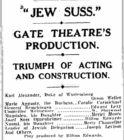Welles read for the part of the evil Duke Karl Alexander in an adaption of Lion Feuchtwanger’s Jew Suss and did enough to impress Edwards and partner Micheál Mac Liammóir that he got the part. His first night was marred by mishaps but he won a standing ovation in a brilliantly erratic performance. [4] Mac Liammóir later wrote that Welles’ put on “an astonishing performance, wrong from beginning to end but with all the qualities of fine acting tearing their way through a chaos of inexperience.” [5]