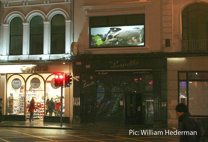 Merrion Row might have a better idea what Rossport looks like after the student demonstrations of last month, but this image from Dame Street is excellent. Right above Lapello’s lap dancing club images of Rossport are screened out to the public. How surreal.