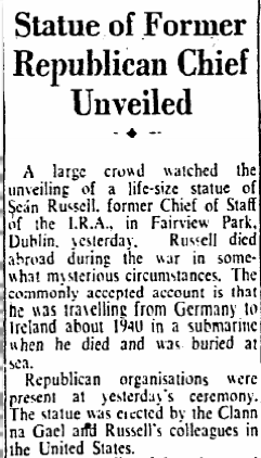 In 2001 Saoirse, the paper of Republican Sinn Fein, published a very interesting Special Branch report on the Seán Russell Memorial unveiling that took place in September 1951. It is said that a writer found it in the Archives during his own research into Russel.