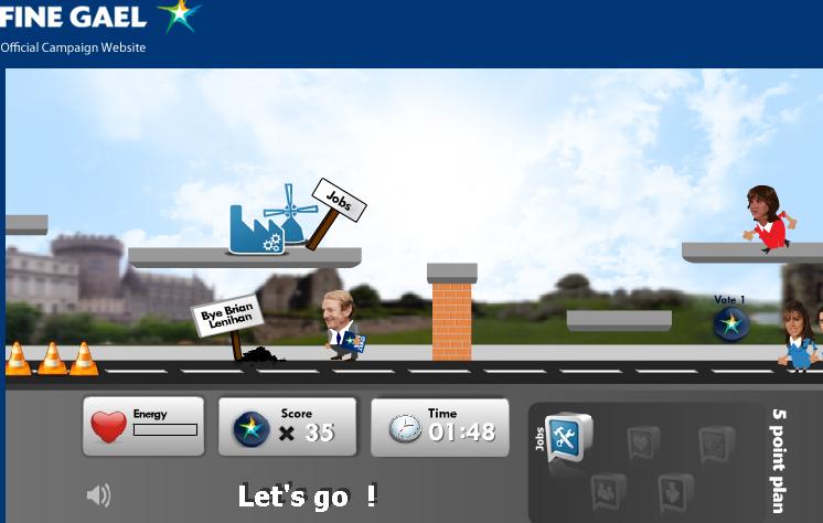 Have you played the Fine Gael ‘game’? Super Mario it ain’t. You get to throw little Fine Gael logos (spacebar) at other party figureheads and…..kill them. Look, Enda just killed Lenihan, and he’s about to kill Joan Burton with a lethal Fine Gael logo.