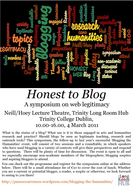 This symposium is a follow-up to last year’s ‘Blogging the humanities’. One of the topics that came out of that day as a central area of concern was the legitimacy of blogging as a medium. What is the status of a blog? What use is it to those engaged in arts and humanities research and practice? Should blogs be seen as legitimate teaching, research and outreach tools? The day will consist of two sessions and a roundtable, in which speakers who have used blogging in a variety of contexts will give their perspectives and respond to questions. There will be plenty of time for discussion. The event is open to all and we especially encourage non-academic members of the blogosphere, blogging skeptics and aspiring bloggers to attend.