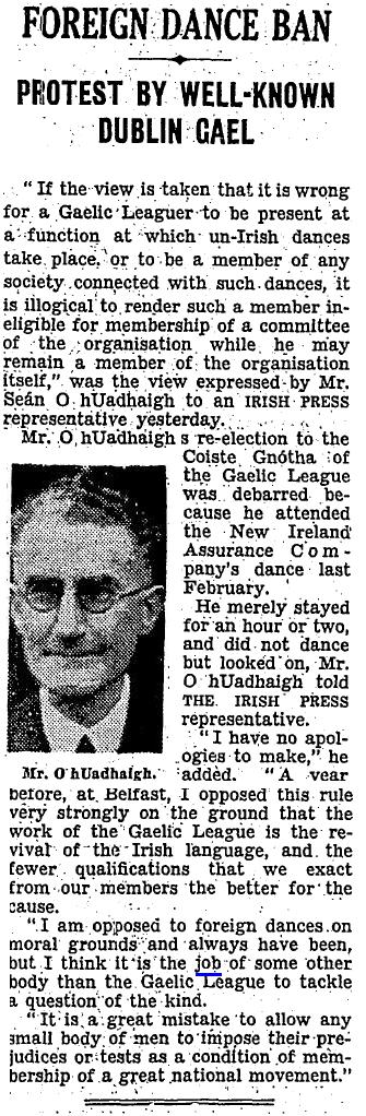 The news report below, from The Irish Press (May 09, 1933), is pretty typical for the period. The man involved was indeed at a ‘foreign dance’ event, but he only stayed an hour or so, and he wasn’t dancing, merely observing.