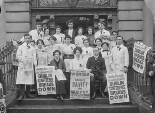 I got a text from hxci to tell me he was only about to upload that great image of the Irish Womens Workers Union when he saw I’d used it on Sunday in another post. It reminded me to upload this image of Delia Larkin, members of the IWWU and male trade unionists who made up the Jacobs Strike Committee on the steps of Liberty Hall. It’s obviously from the same day, and is a wonderful image that doesn’t show up as often.