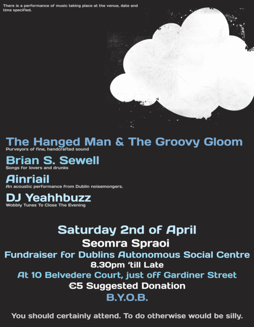 The bills don’t pay themselves sadly and spots like this need your support. Seomra Spraoi has always stayed true to its roots as an anti-capitalist venture and as such the Arts Council and the sort are far from the door. Engagement with the space is crucial if it is to survive. Get down.