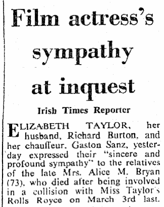 In 1967, Taylor returned to Dublin in more somber circumstances. During her initial visit two years previously, her chauffeur-driven car had knocked down and killed an elderly pedestrian on the Stillorgan Road. Taylor returned to attend the coroner’s report and court hearing. To make it even more tragic, the chauffer himself, Gaston Sanz, had just returned from France where had buried his 16 year old son who was killed in a shooting accident.