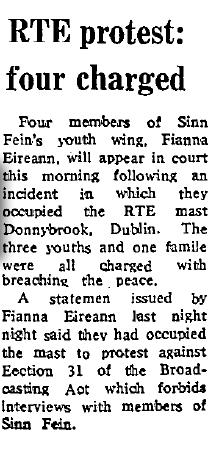 I rooted out this Indo report from June 14 1984, when a number of young republicans took to the mast in protest at RTE’s censorship of republican voices. Of course, RTE today is a completely impartial news source and I’m known to be a huge fan.