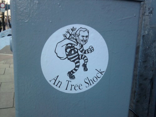 The Tree Shock campaign was done by a group called Evenprime. The stickers were made to be easily removed rather than to be vandalism. The idea was that they’d jog the memory when the subject of Bertie Ahern and his interest in Ireland’s forestry was mentioned. There were a LOT of them around government buildings for a while.