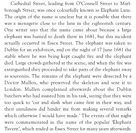 How did Elephant Lane get its unusual name? Frank Hopkins, in the ever wonderful Rare old Dublin: heroes, hawkers & hoors (Dublin, 2002) speculates: