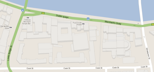 Today, only one of those four remains – Skippers Alley and it can be seen on Google Maps (just before the ‘M’ in Merchants Quay) It’s quite unusual that Google Maps included such as nondescrript lane, they usually don’t.