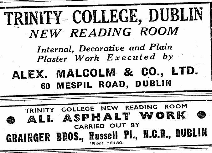 In 1937, to the tune of £25,000, the new Reading Room was finally ready to open. Ironically, it was a vetaran of the 1916 rising who was to open the Reading Room attached to the College War Memorial, in the form of President de Valera. In his speech the President talked of Thomas Davis, a graduate of the college, quoting his words: “Beside a library, how poor are all the other greatest deeds of men”