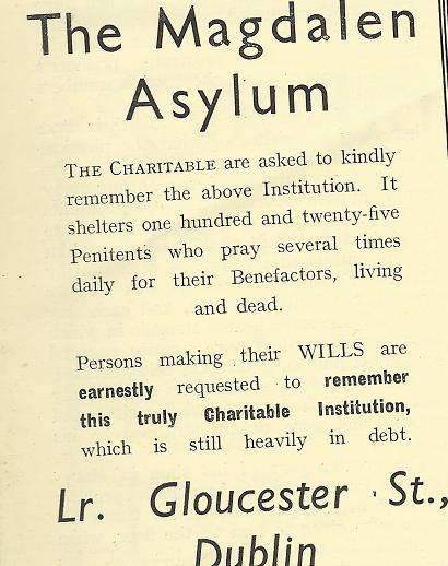 Firstly, this ad for the Magalen Asylum on Lower Gloucester Street caught my eye. “It shelters one hundred and twenty-five Penitents who pray several times daily for their Benefactors, living and dead.” Chilling.