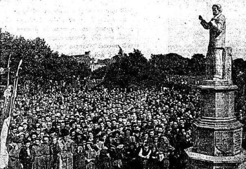 The Seán Russell statue was unveiled on Sunday, September 9th 1951. A march of over 1,000 republicans made their way to the monument from Parnell Square, where they were joined by members of the public. A Garda Special Branch report into the march noted that among the organisations and individuals present were in excess of 130 Dublin IRA men led by Cathal Goulding, Cumann na mBán, the ‘Girls Piper Band’ from Dublin, the Transport Workers’ Union Band and republican contingents from both Cork and the north. Members of the Dublin Corporation and the GAA were also identified by the Special Branch. Republican representatives from Clan na nGael in America were among the crowd and would play a leading role in the ceremony at Fairview.