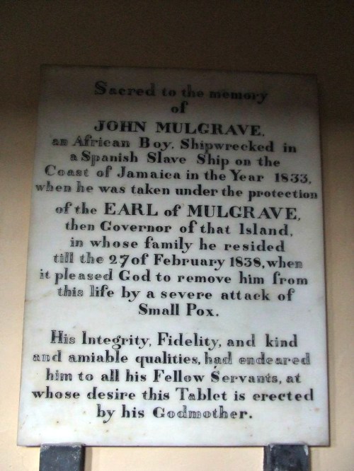 The church contains a plaque and a framed image of John Mulgrave, ‘The African Boy’. The story is that a young African boy was shipwrecked in a Spanish Slave Ship on the Jamaican coast in 1833, and that he was taken under the protection of Constantine Henry Phipp, the Earl of Mulgrave, the Governor of the island of Jamaica who went on to become the Lord Lieutenant of Ireland from 1835.