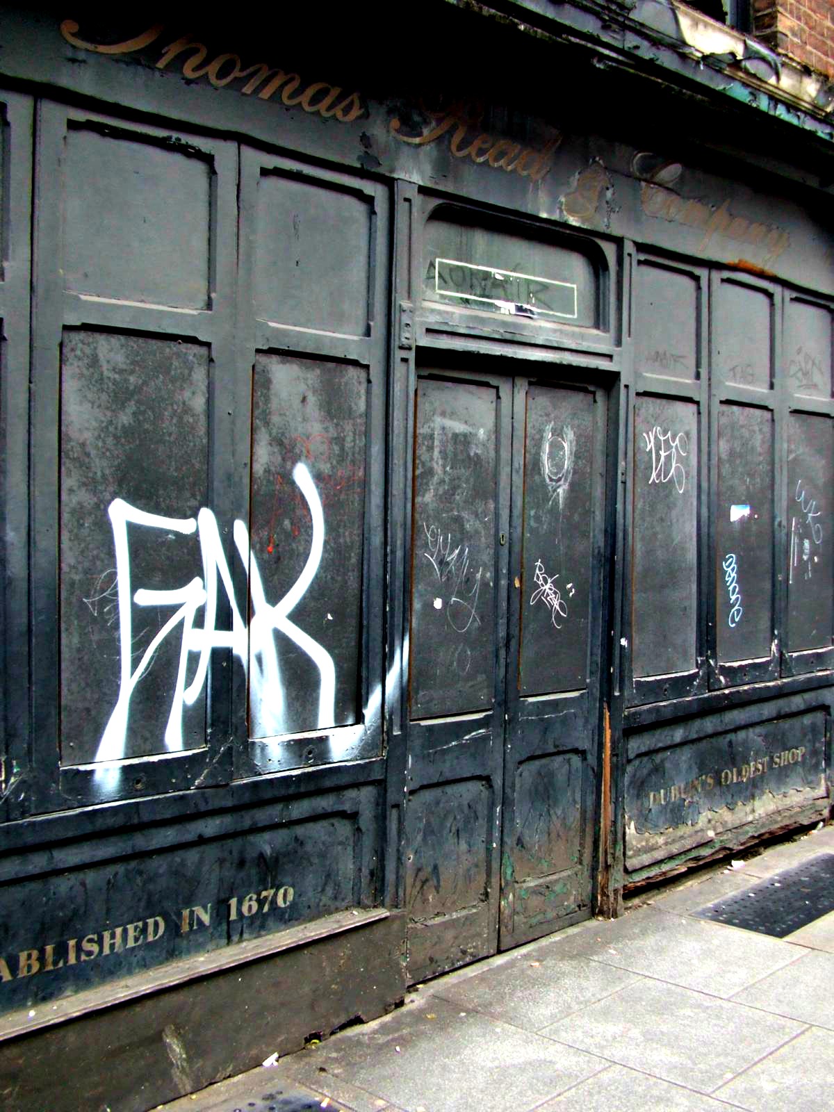 I swung by for a look yesterday, and the shopfront on Parliament Street has fallen into a very tragic state. At the very bottom, where it reads ‘Established in 1670’ on one side and ‘Dublin’s Oldest Shop’ on the other, damage and decay is clear to be seen. Unsurprisingly, the shopfront has been vandalised too.
