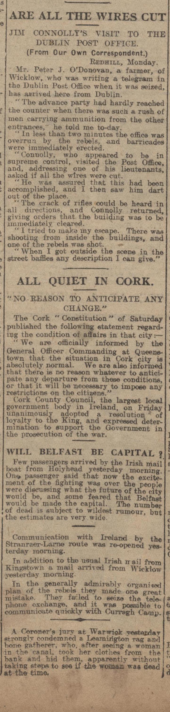 I particularly like the last piece, speaking of the excitement in the city post-rising, with fears abound that Belfast might be the new capital. There are some other interesting scans which I’ve yet to upload, including a great image of Markievicz working in a soup kitchen during the Lockout of 1913, I’ll get them up in due course!