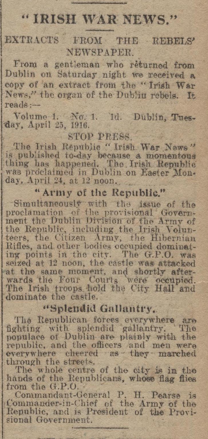 Last week, DFallon put up some excellent scans from the Portland Daily Press, from May 1st 1916. In his article, he made the remark that “It’s fascinating to see how news travels and is distorted or in some cases completely fabricated.” Reading back on any newspapers reports from Easter Week shows how difficult creating factually correct copy was in a time before the internet and social media. Above and below are some scans from two papers I picked up recently, chance finds on eBay, they help illustrate this fact, with papers on the first of May pronouncing Connolly dead and Pearse shot and captured near Boland’s Mills. This is clarified on the second of May.