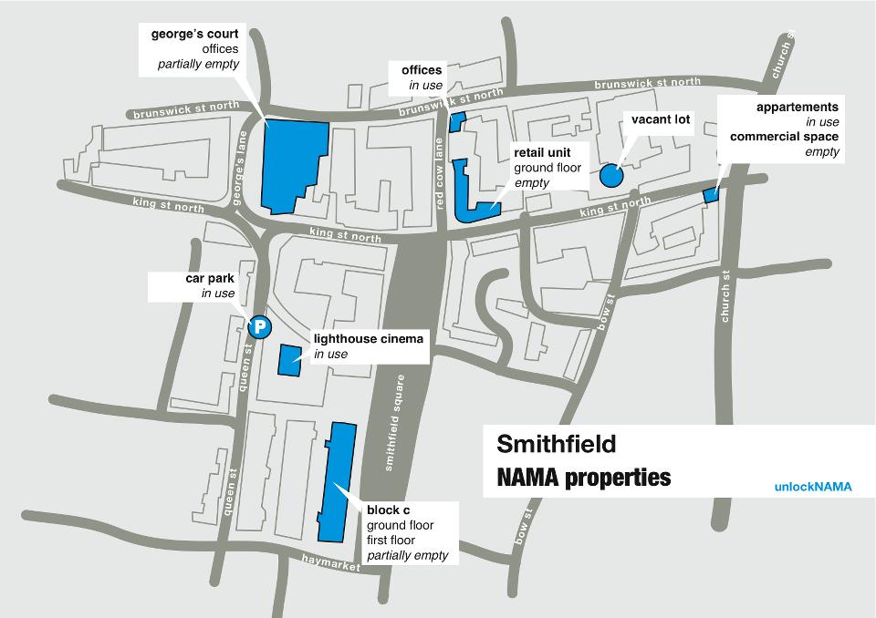 This is a very interesting map compiled by the folks at Unlock NAMA, and I must say the idea of mapping the city like this a good one. It really brings NAMA to life when you see what falls under its ownership list in an area the size of just Smithfield. Unlock NAMA are holding two discussions in the area in the days ahead. The first discussion will take place in the Macro Community Resource Centre on North King St., at 7pm on Wednesday the 20th of June, while the second discussion will happen in the Prussia Street Parish Centre, 7.30pm on Thursday the 21st of June.