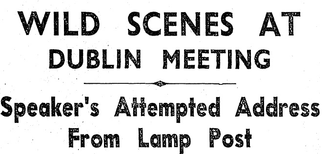 The following day, on the 13th April, a left-wing meeting at College Green came under siege when thousands gathered for a rally featuring speakers from the left including Peadar O’Donnell and Willie Gallacher. Garda reports estimated that the crowd numbered between four and five thousand. They estimated that 98% of this crowd were hostile to the left-wing speakers at College Green. Prior to this meeting even beginning, newspaper reports noted that Gardaí lined College Green 100 strong. Peadar O’Donnell would be the only speaker on the night, addressing the crowd from a lamppost. In an obituary printed at the time of O’Donnell’s passing at the fine old age of 93, it was claimed that O’Donnell was met by “potatoes (with razor blades embedded in them), bottles and stones.”