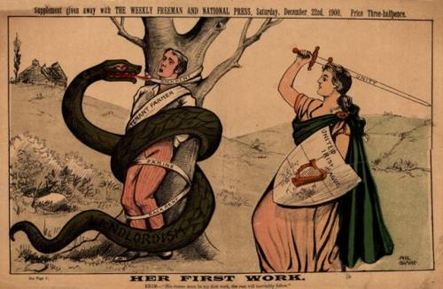 In about 1898 Phil Blake succeeded Thomas Fitzpatrick as chief cartoonist on the staff of the Freeman’s Journal. His art nouveau style was something of a departure.