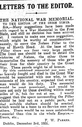 In July 1925, the issue of moving the Pillar to the Hill of Howth was discussed at a meeting of the Howth Urban District Council. Opinion was split on the matter, with some arguing the Pillar would take away from the beauty of the area. Interestingly, the potential security threat posed by having the Pillar in Howth was also raised. The Howth Urban District Council decided to wait and see if the monument was indeed to be removed from O’Connell Street before voting on the issue, and ultimately it was decided to leave Nelson in place. it was not the last time the idea was raised, as this letter from 1931 shows: