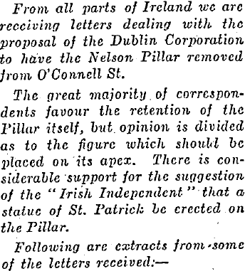 In December 1931, the Irish Independent itself put forward the idea that Saint Patrick should sit on top of the monument, and that if the statue itself was replaced the Pillar could remain in its current location.