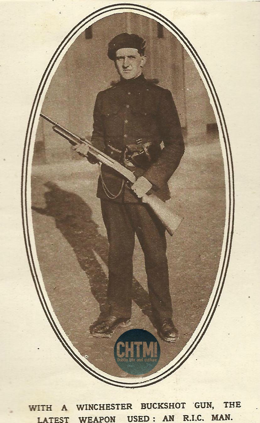 This full body snap shows a young R.I.C man clutching a Winchester Buckshot Gun, “the latest weapon used” in the war.