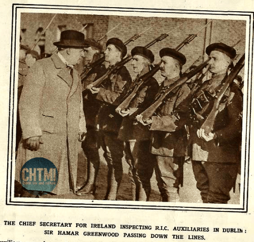 The images below are scanned from an original copy of the Illustrated London News from January 1921. They show Hamar Greenwood, Chief Secretary for Ireland, inspecting R.I.C Auxiliaries in Dublin at Beggars Bush Baracks.As D.M Leeson has noted in his study of The Black and Tans, Greenwood ‘described the Irish insurgency in almost hysterical terms’ when he noted that “For years past now Sinn Féin extremists and their Soviet colleagues in Ireland – their Sovietism in a marked degree in Ireland- have conspired to smash the empire.”