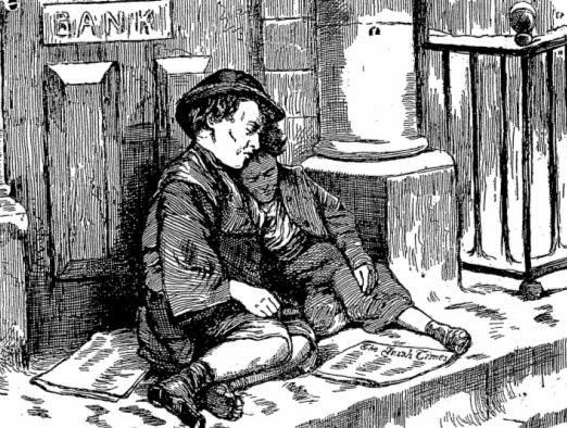 I’ve always loved this illustration of two Dublin newsboys from The Irish Times, published in 1884. It is the earliest illustration of Dublin newsboys I’ve been able to find, and shows two ragged youngsters resting in the doorway of a bank premises.