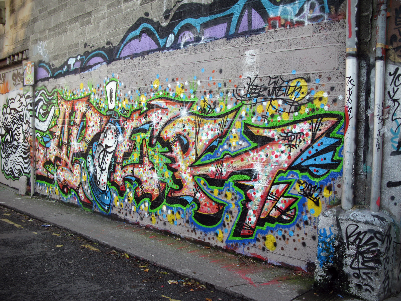 My apologies to Poxbottle, who asked that any posts referring to Irish graffiti not be called “The writings on the wall…” Its only for this short series, I swear! Anyways, last week I put up some images of the street art behind the Bernard Shaw and said I was going to follow it up, so here it is… The lane behind Whelan’s/ The Village. I’m hoping to get another couple of these posts up in the next week or so, there’s a some more hidden spots around Dublin city where our street artists show off their talents that are worth documenting…