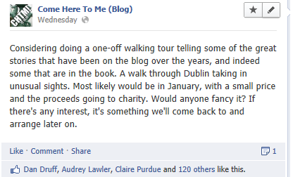 Earlier in the week, I asked on Facebook if readers would be interested in the idea of taking a charity one-off walking tour with us. I work with a tour company professionally (Historical Insights, we’re the lovely people you see outside the front gate of Trinity) and the idea of a one-off tour focused around the blog and book appealed to me, with the other lads chipping in a tale or two along the route. In the spirit of Come Here To Me the tour would be done for charity, and while obviously I’d like to contact them before putting any names here, it’s the elderly of Dublin we’ve had in mind.