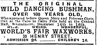This March 1916 advertisement is typical of the shows performed at the waxworks, when the “original wild dancing bushman” visited: