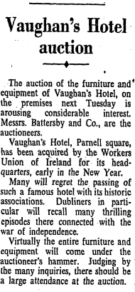Vaughan’s Hotel was acquired in 1953 by the Workers Union of Ireland, and remains a home of the trade union movement to this day. The sale of the building in 1953 attracted some controversy, owing to the strong connection between the premises and the War of Independence. The Irish Times reported on an auction of the hotels contents in November 1953, writing that: