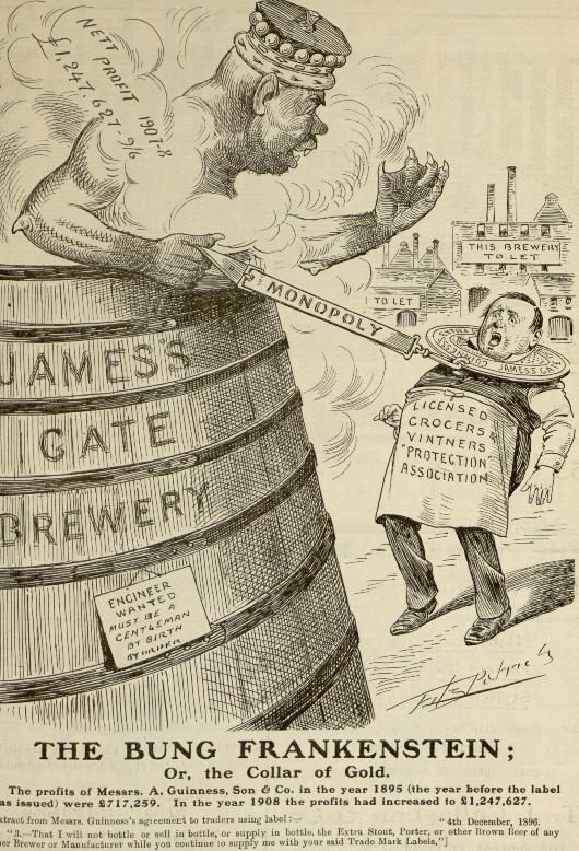 This cartoon is taken from a 1908 edition of The Lepracaun, a satirical magazine founded by the cartoonist Thomas Fitzpatrick in 1905. A monthly publication, it featured some biting satire and James Joyce was among its contributors. This cartoon from 1908 deals with the issue of relations between the Guinness Brewery and other brewers in the city, and relates to the manner in which Guinness would not allow their traders to use Guinness labels if they continued to supply any other porter or stout, something which led to their profits almost doubling in a period of just over ten years.