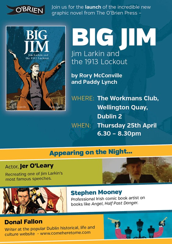 I’m delighted to have been asked to say a few words at the launch of a new comic book on Big Jim Larkin, which comes from O’Brien Press. Following on from their graphic novels exploring the Easter Rising and the War of Independence, this new work looks at the Dublin Lockout of 100 years ago. Sharing a stage with Jer O’Leary is always a bit daunting, the last time I done that was in a school in Ringsend, where I saw him captivate an audience of kids with his Larkin performance. Also speaking is Stephen Mooney, a well-established comic book artist and illustrator.