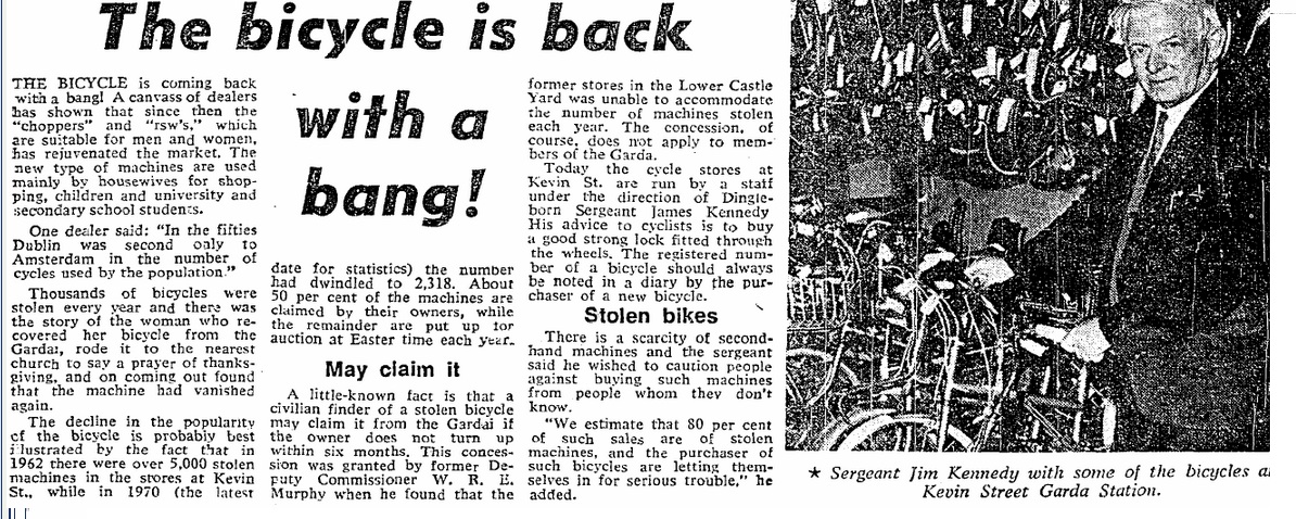 By the 1970s, the stealing of bicycles in Dublin features less and less in newspapers.This interesting article from the Sunday Independent in 1972 notes that “in 1962 there were over 5,000 stolen machines in the stores of Kevin Street, while in 1970 the number had dwindled to 2,318.”