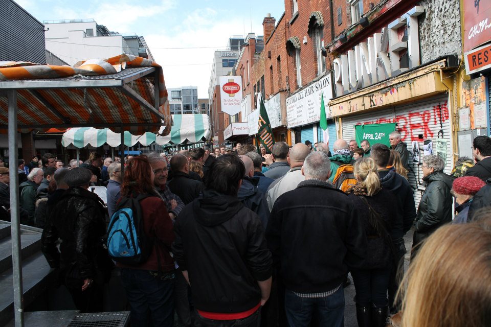 Hundreds gathered on Moore Street today to demand that the hugely important street be preserved. In recent times campaigners have been split over the issue of just what should be saved, with some relatives of 1916 leaders seeming happy for a small terrace of houses to be preserved within a new development, while the majority of the relatives and others argue that the entire terrace of houses, and the laneways around it, should be designated a national monument. Personally, I think another shopping centre is the last thing the city needs, and I feel we’re not using Moore Street and the area around it to its full potential.