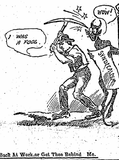 The theme of workers realising the error of their way and returning to work was commonplace in the paper. This cartoon shows a rather sinister looking fella, Syndicalism, looking on in astonishment at a Dublin worrker who has returned to work!