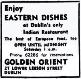 The next big milestone in the Indian restaurant timeline was opening of the Golden Orient at 27 Lower Leeson Street in February 1956 by Mohammed ‘Mike’ Butt, a Kenyan of Kashmiri descent and his Dublin-born wife Terry Foy, a Cathal Brugha Street College of Catering graduate. It served generations of journalists, students and Indians until about 1987. (A biography of the pioneering Butt can be read here)