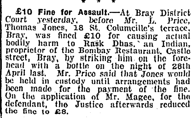 There was an Indian restaurant in the early 1940s called the Bombay on Castle Street, Bray, County Wicklow owned by Rask Dhas (or Ras K Das). A young man was fined £10 for hitting the proprietor in the head with a bottle in April 1941.