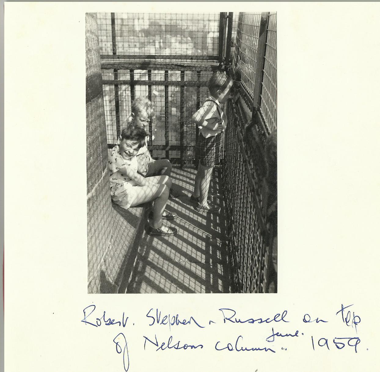 From buying second-hand books over the years, I know that anything and everything can fall out of them. Old currency, bus passes, mass cards, match tickets and you name it. Still, I was surprised when I opened this book to see a picture of three kids on top of the monument, looking down over Dublin from the viewing platform! Not alone this, but the youngsters were named as Robert, Stephen and Russell. Taken in 1959, it’s highly likely they are still among us today, but they could be anywhere in the world.I’ve a hunch the kids might be English, owing to the fact that they refer to Nelson’s Column and not Nelson’s Pillar.