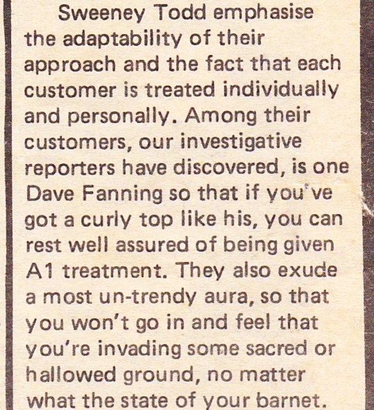 In Liffey street upper in the 70’s there was a barber whose name was (ah think) Todd Fletcher. He was nicknamed Sweeney Todd as well. It’s where we got our first skinheads.