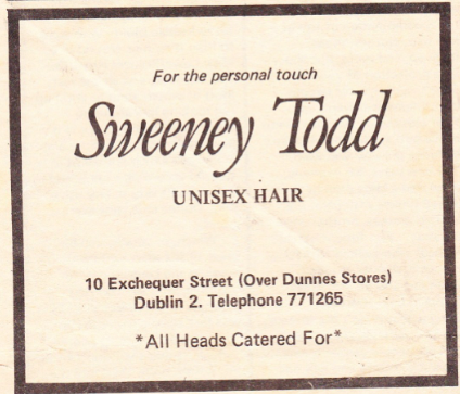 Sweeney Todd’s was a unisex hairdresser based over Dunnes Stores at 10 Exchequer Street, just off South Great George’s Street and opposite the Central Hotel.