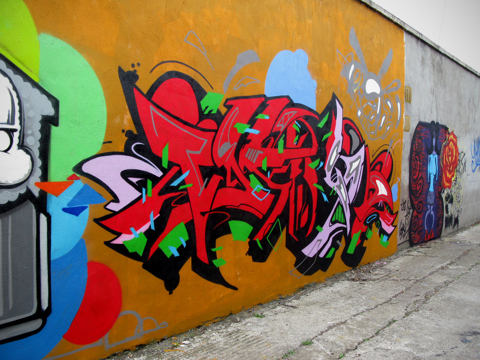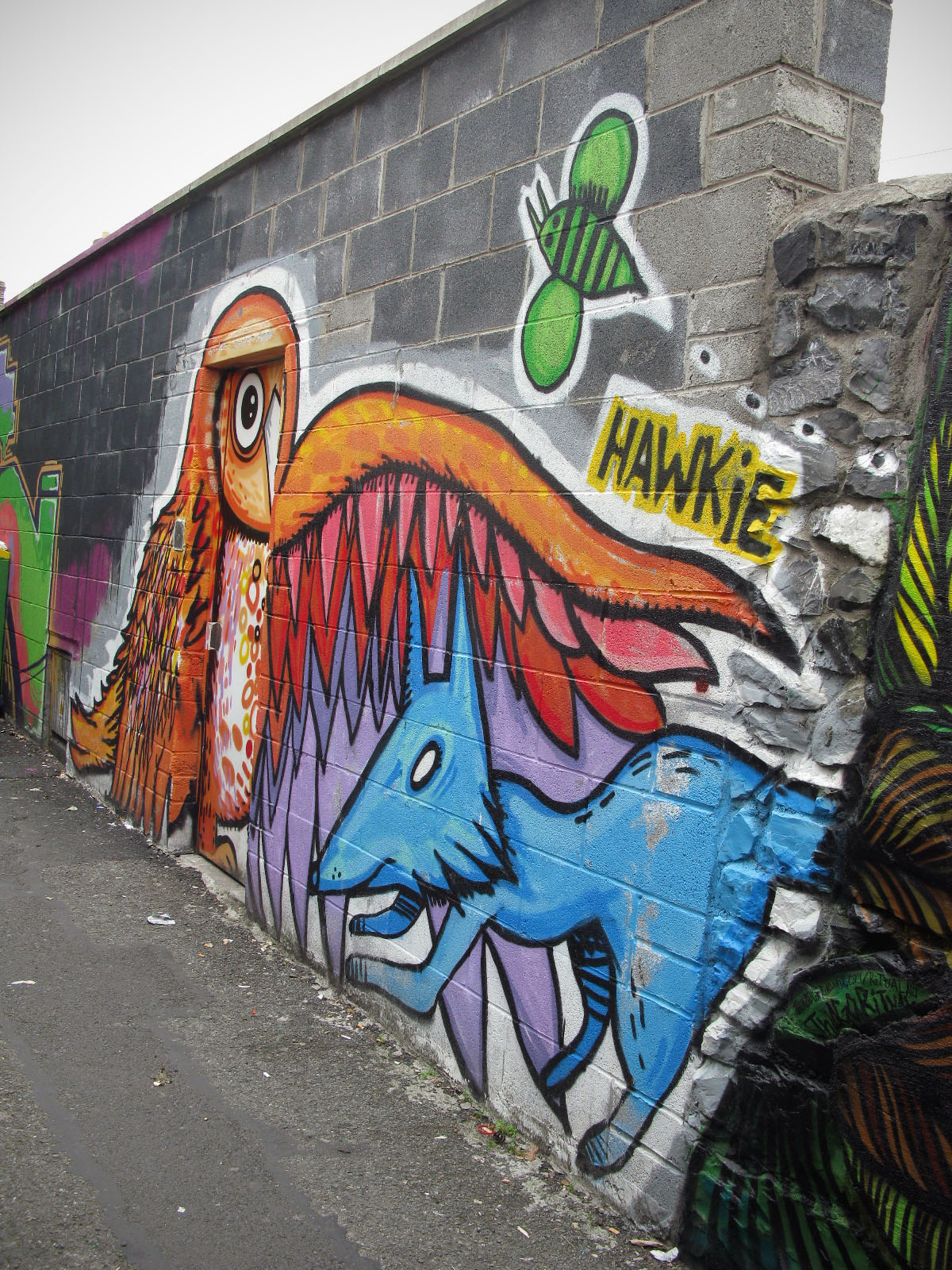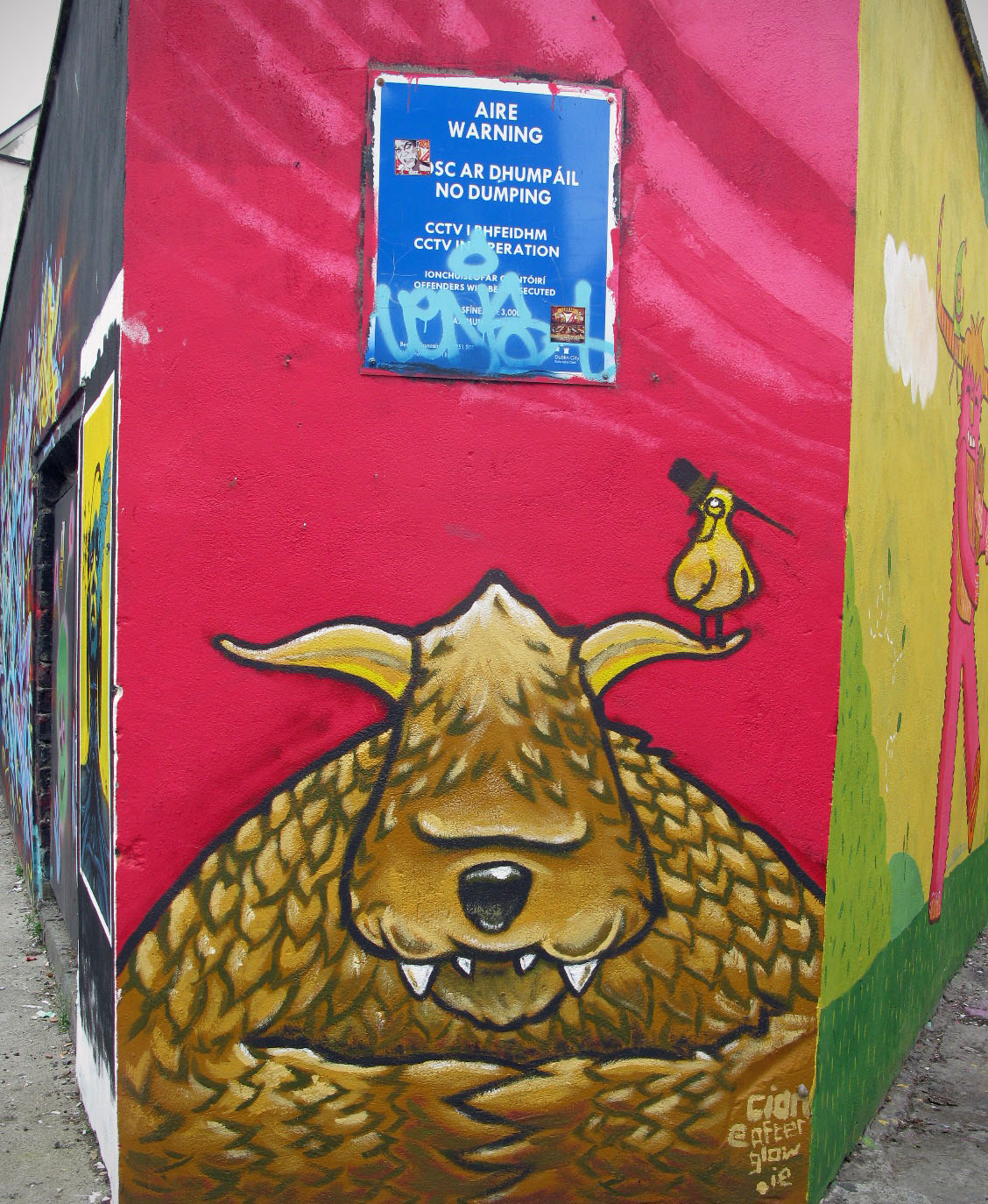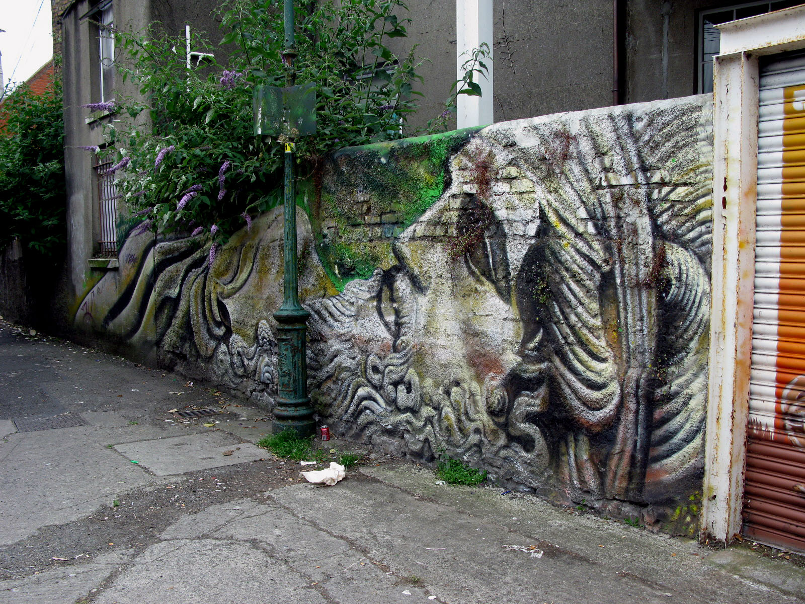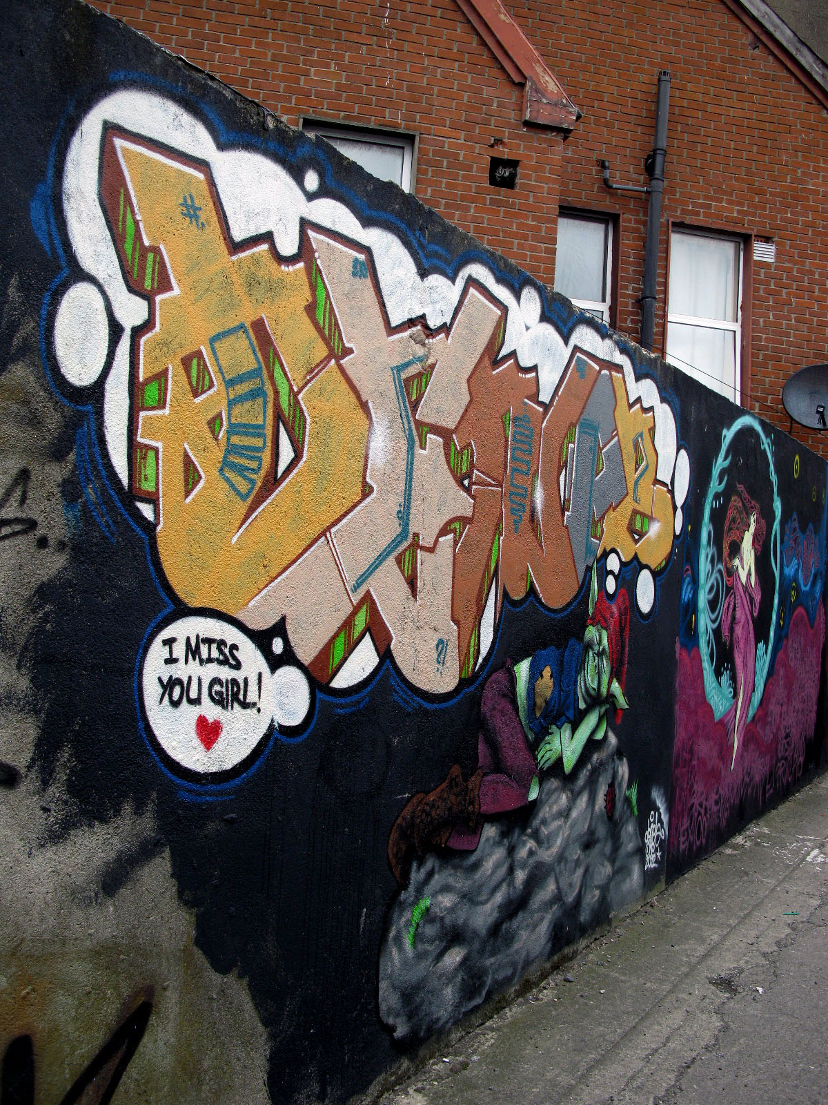 As small as Dublin is, and as much of it as I’ve covered traipsing around on my bike, the city never ceases to throw up surprises. Heading off on the bus to Dundalk from Dalymount on Friday evening (a beautiful evening on a hijacked double decker bus, ending in a rubbish defeat and getting home at silly o’clock on Saturday morning,) I spotted some graffiti at the entrance to the lane-way linking St. Peter’s Road with Cabra Park. Heading up for a look this evening, I wasn’t let down, with another trove of street art from some of Dublin’s finest. Sorry for the angles on some of the shots, the alley is so narrow as to make a head on shot impossible!
