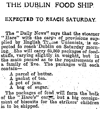 It took until 8 p.m to unload the Hare and until 9 p.m to finish distribution at the South Wall. More workers’ families were supplied from carts that took consignments of food for distribution in Kingstown, Clondalkin, Swords, Lucan and other parts of County Dublin. By the end of the day nine thousand workers and their dependants had received provisions.
